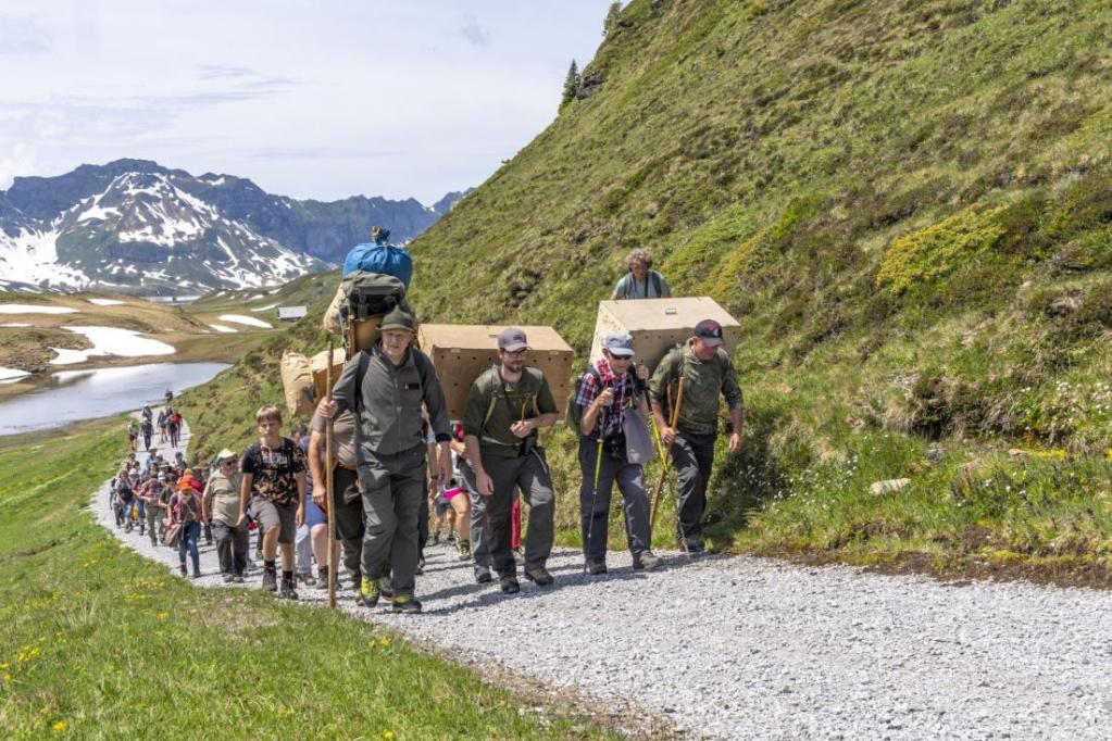 An der Auswilderung nahmen rund 300 Personen teil. Es seien zwei vorwitzige junge Bartgeier, sagte Daniel Hegglin, Geschäftsführer der Stiftung Pro Bartgeier. Sie hätten trotz des anstrengenden Tages sofort begonnen, die Nische zu erkunden.