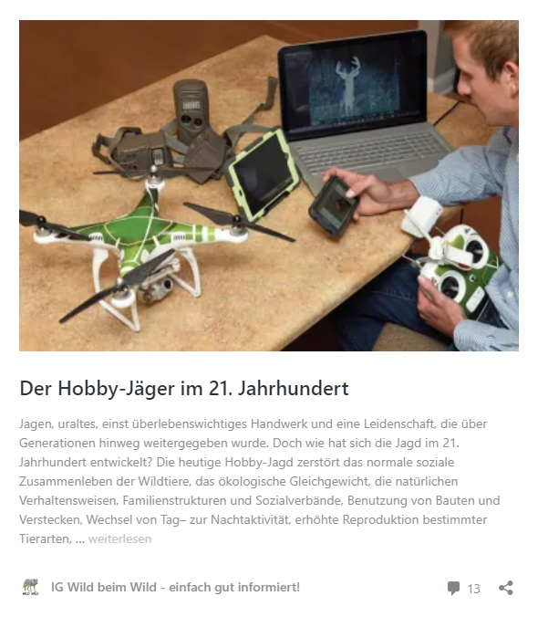 Die heutige Form der Jagd dient in erster Linie dazu, wirtschaftliche Interessen mit der Waffe durchzusetzen. Durch die Hobby-Jäger werden Wildtiere erst in den Wäldern parkiert, um sie anschliessend als Schädlinge zu titulieren. Hobby-Jäger sind Erfüllungsgehilfen falscher Ideologien.