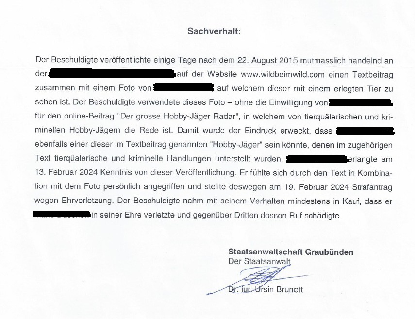 Im Frühjahr 2024 flatterte wildbeimwild.com ein Strafbefehl der Staatsanwaltschaft Graubünden ins Haus. Der Vorwurf: Ehrverletzung. Der Rechnungsbetrag für Busse, Barauslagen und Gebühren 1’245.– Franken. Die Fakten: Die angebliche Tat liegt ein Jahrzehnt zurück. Der Antrag wurde viel zu spät gestellt. Und das Delikt war seit Jahren verjährt. Der Beschuldigte kannte den Kläger nicht.