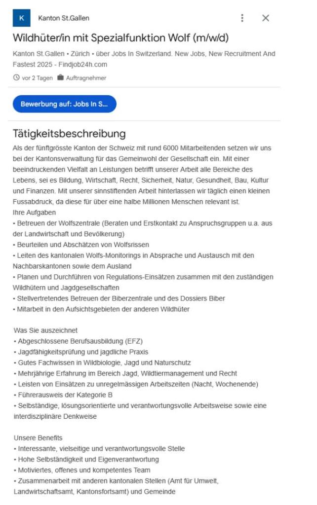 Wer echten Tierschutz und eine sachliche, wissenschaftlich fundierte Debatte über den Wolf will, sollte diese Stellenausschreibung kritisch lesen und sie im Kontext des gesamten Dossiers zur St. Galler Jagdverwaltung betrachten.