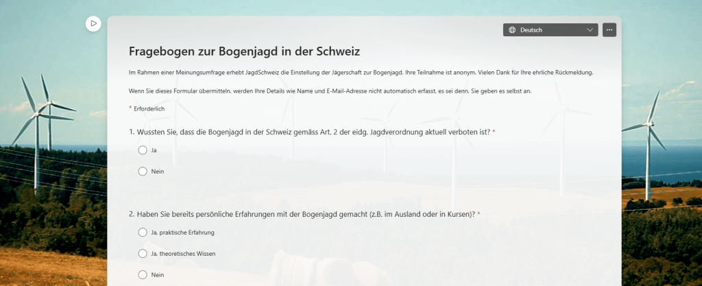 Der militante Verband Jagd Schweiz hat nun einen Fragebogen vor dem Foto eines Solarparks zur Hobby-Jagd mit Pfeil und Bogen in der Schweiz veröffentlicht.