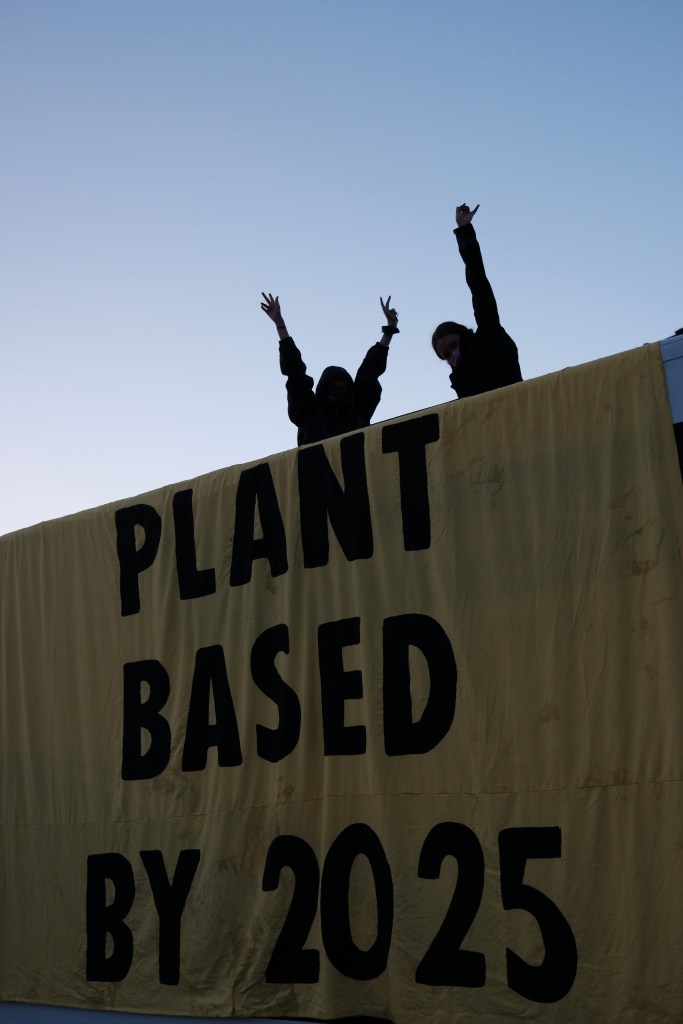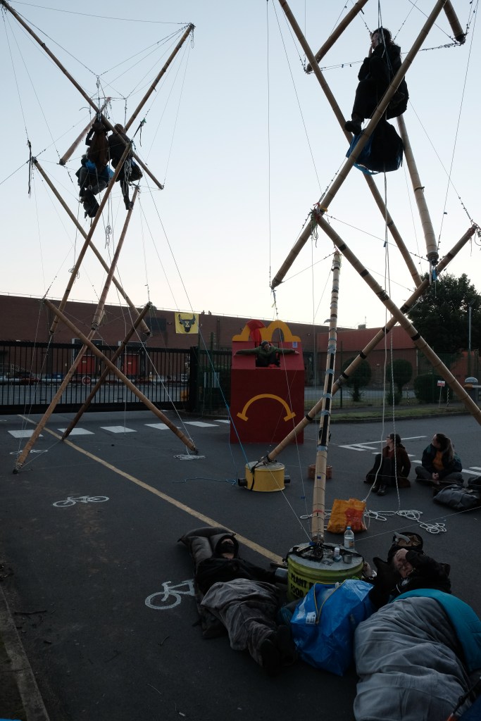 Dieser Protest kommt, nachdem die Gruppe bereits vor zwei Monaten vier Distributionszentren von McDonald’s blockiert hat, um die Fleisch- und Milchindustrie für ihre Rolle in der Klima- und Umweltkatastrophe, die die Lieferkette von McDonald’s in Mitleidenschaft zieht, anzuprangern.