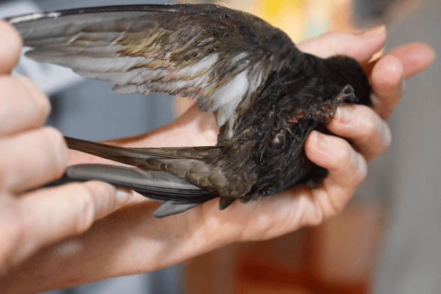 Leider wird in der Station festgestellt, dass die Zahl der verletzten Altvögel jährlich stark zunimmt. Nebst den „klassischen“ Verletzungen durch Anflüge in Glas werden immer mehr Segler mit stark verklebtem Gefieder in die Station gebracht. Offenbar sind sie beim Anflug auf ihr Nest mit einer hartnäckig klebrigen Substanz in Berührung gekommen und/oder hängengeblieben. Ein Vogel in diesem Zustand, wenn er sich denn überhaupt noch ablösen kann, verliert seine Flugfähigkeit und stirbt einen jämmerlichen Tod, falls er nicht – und das werden wohl die wenigsten – gefunden und umgehend in eine Pflegestation gebracht wird. Ursache des verklebten Gefieders ist eine sogenannte Taubenabwehrpaste, die immer mehr angewendet wird, um Gebäude vor Vögeln „zu schützen“!