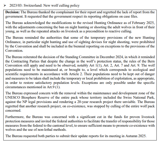 Згідно з Бюро Бернської конвенції, яке все ще очікує звіту від Швейцарії, популяції вовків повинні підтримуватися відповідно до екологічних вимог. В опублікованому протоколі Федеральне відомство з охорони навколишнього середовища (FOEN) знову закликають виконати своє зобов'язання щодо звітності.Катрін Шнебергер обійняла посаду директора Швейцарського федерального відомства з охорони навколишнього середовища (FOEN) у вересні 2020 року та неодноразово привертала негативну увагу з боку IG Wild beim Wild (Групи інтересів дикої природи).